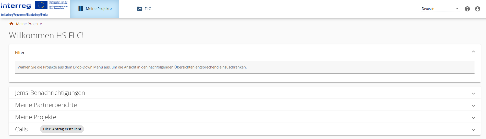 Auf der Startseite „Meine Projekte“ sieht der First Level Kontrolleur verschiedene Übersichten mit Informationen zu allen Projekten, in denen Projektpartner beteiligt sind, für die seine Kontrollstelle zuständig ist. Die Projekte werden aufgelistet, sobald die zuständige Kontrollstelle dem Projektpartner im Jems zugewiesen wurde. (siehe unten 6. Verwalten von Kontrollstellen im Jems)