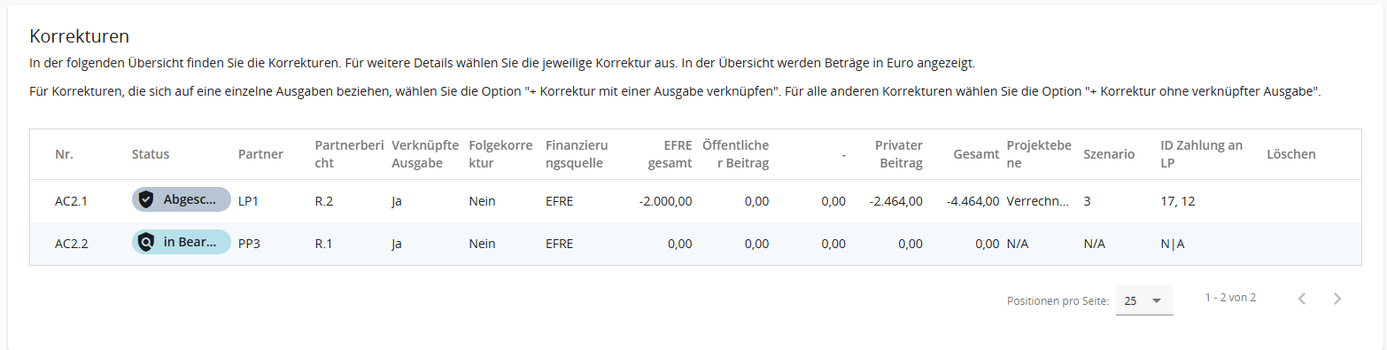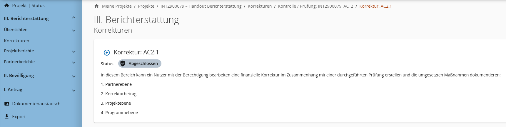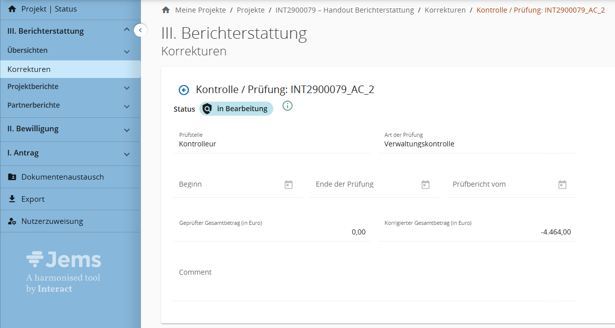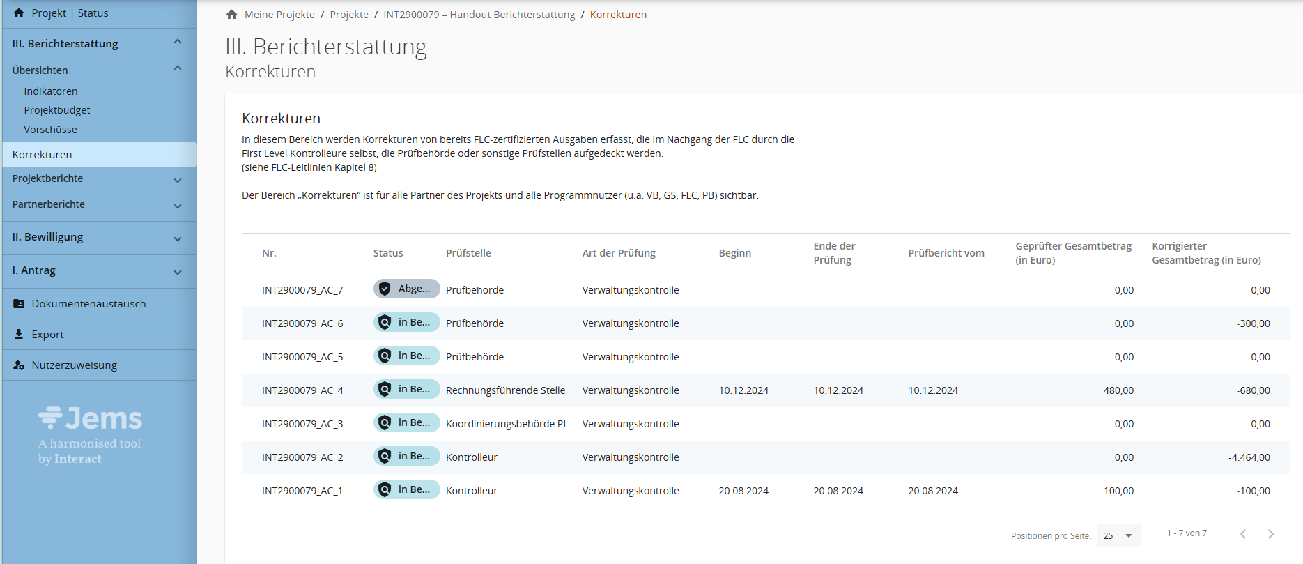 In dem Bereich „III. Berichterstattung“ finden Sie den Abschnitt „Korrekturen“. Hier werden alle Korrekturen von bereits FLC-zertifizierten Ausgaben erfasst, die im Nachgang der First Level Kontrolle durch die First Level Kontrolleure selbst, die Prüfbehörde oder sonstige Prüfstellen aufgedeckt werden (siehe FLC Leitlinien Kapitel 8). Die Korrekturen werden für ein Projekt durch die Rechnungsführende Stelle im Jems erfasst und sind für alle Projektpartner einsehbar.