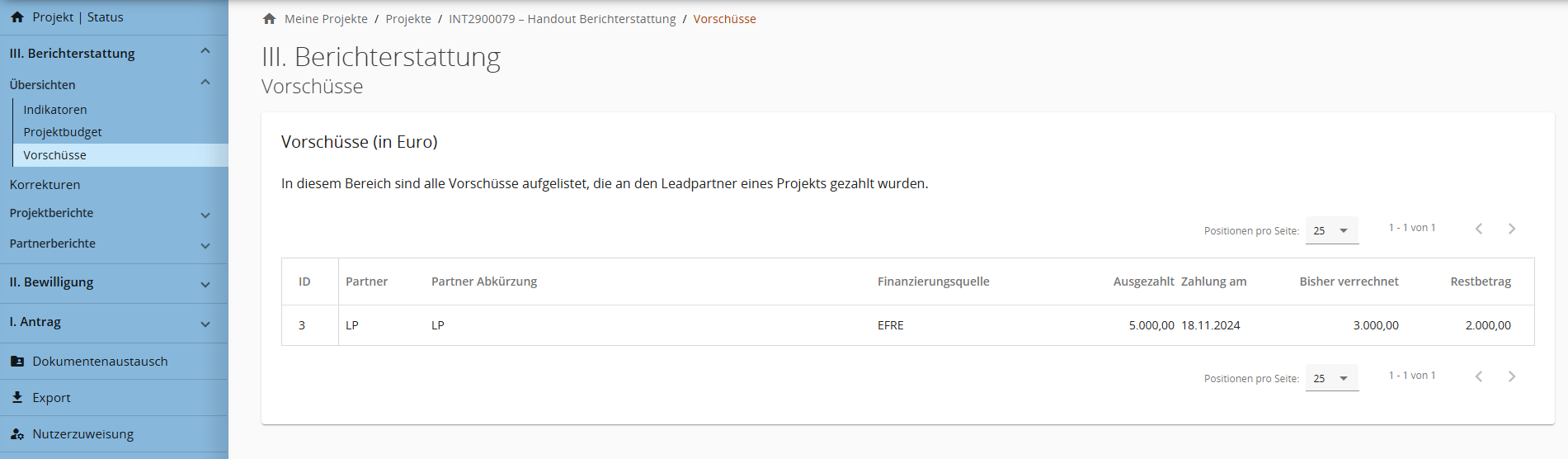 Im Bereich „III. Berichterstattung“ finden Sie unter dem Abschnitt „Übersichten“ den Reiter „Vorschüsse“. Der Reiter „Vorschüsse“ wird nur angezeigt, sofern die Rechnungsführende Stelle Vorschüsse für einen Projektpartner ausgezahlt hat. Die Vorschüsse sind nach Projektpartner aufgelistet. Der Stand der Verrechnung von Vorschüssen ist über die Spalte „Bisher verrechnet“ erkennbar. (siehe Programmhandbuch Kapitel 5.2.8 Kleinteilige Projekte – Berichterstattung, 6.1 Fördervertrag)
