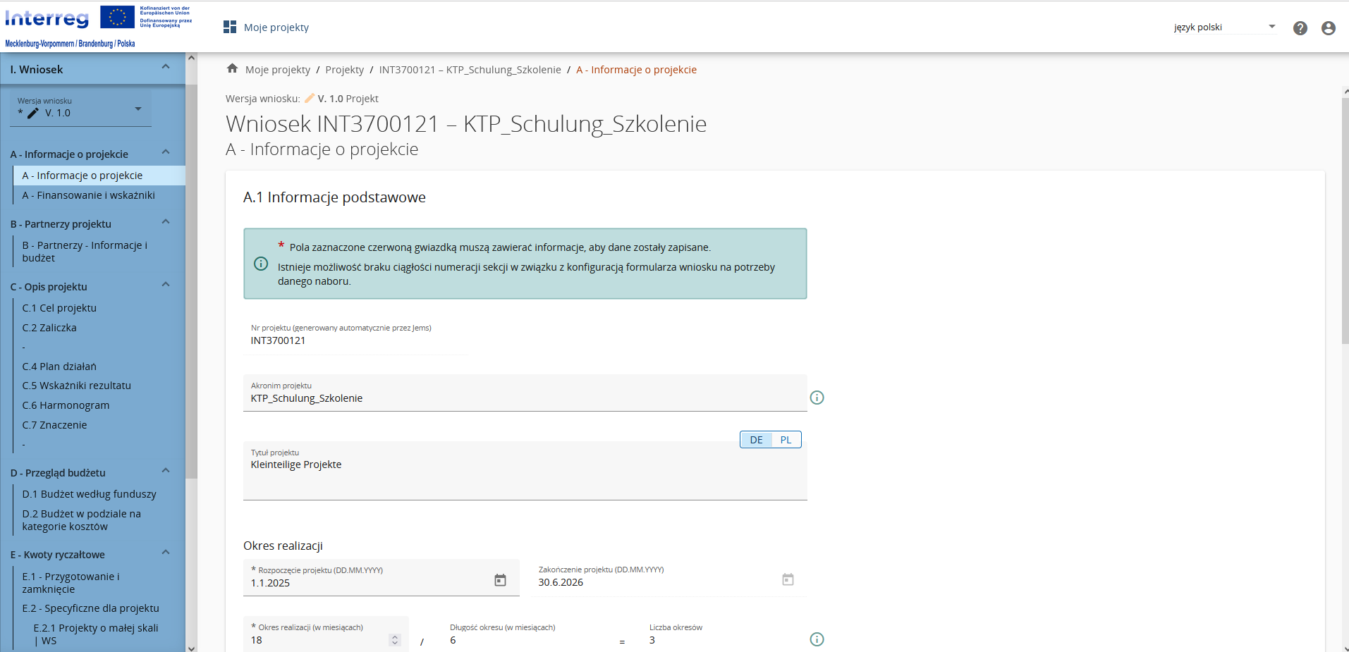 Wniosek w systemie Jems został uproszczony dla projektów o małej skali i dostosowany w następujący sposób: