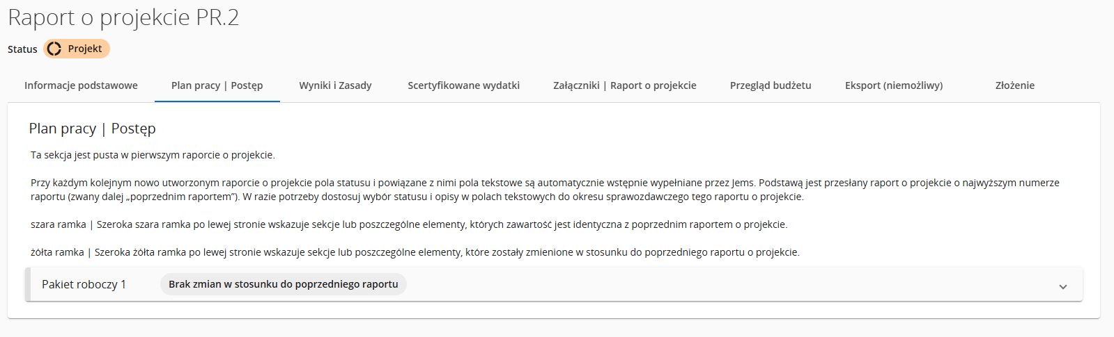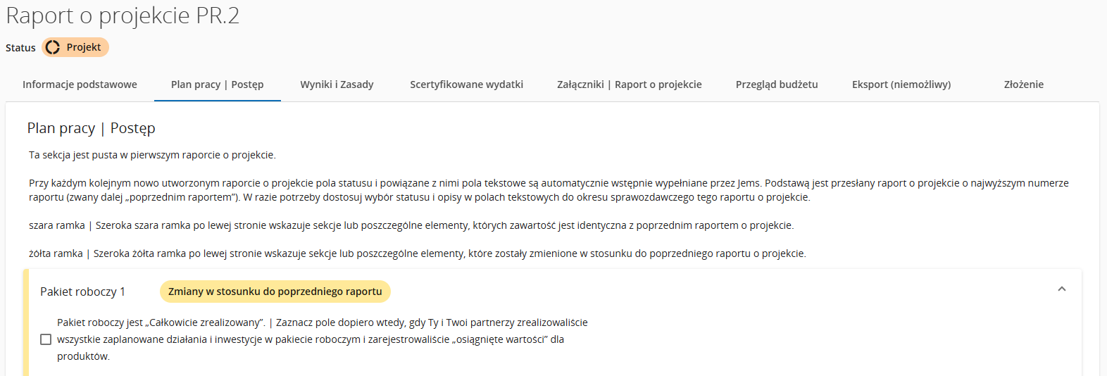 Nowość od wersji 13: W raporcie o projekcie, w zakładce „Plan pracy | Postępy” zaznaczone są sekcje, w których zostały wprowadzone zmiany w porównaniu z ostatnim złożonym raportem o projekcie. Pola tekstowe w tej zakładce są standardowo automatycznie wypełniane przez Jems danymi z ostatnio złożonego raportu o projekcie (z najwyższym numerem raportu) (wyjątek: 1. raport o projekcie). Jeśli użytkownik wprowadzi zmiany, zmieniona sekcja oraz poszczególne zmienione elementy zostaną zaznaczone szeroką żółtą ramką po lewej stronie i pojawi się żółta wskazówka „Zmiany w stosunku do poprzedniego raportu”.