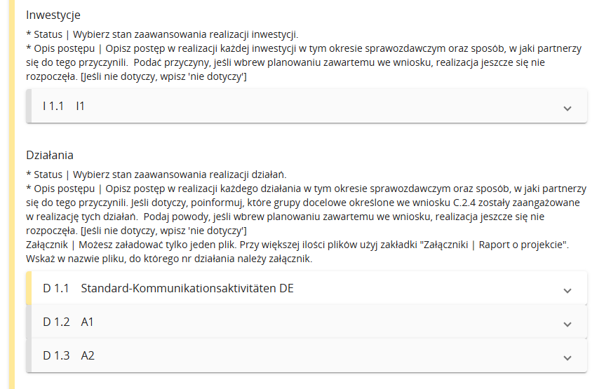 Partner wiodący dostarcza informacji na temat stanu realizacji inwestycji, działań i produktów z perspektywy całego projektu. Należy również przedstawić zakres, w jakim partnerzy projektu przyczynili się do tego.