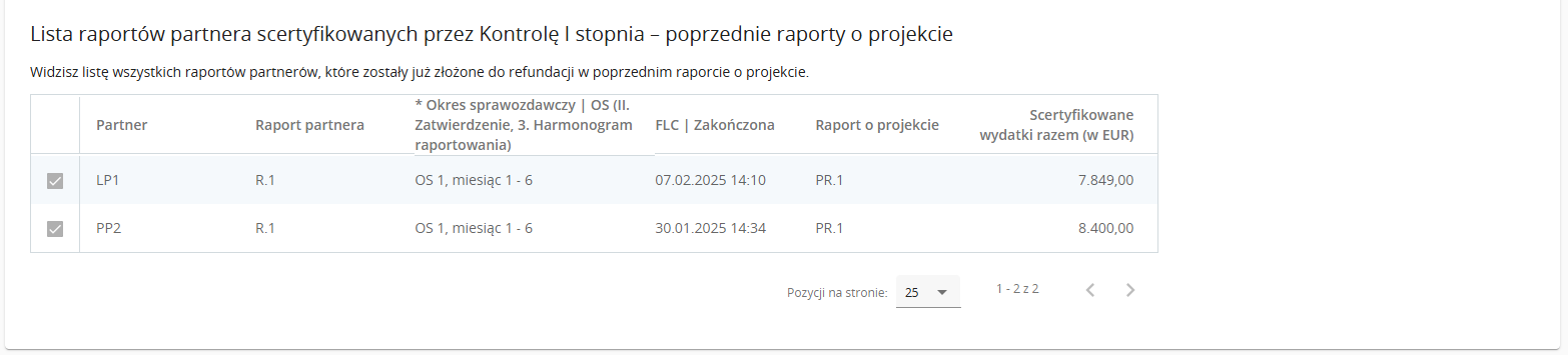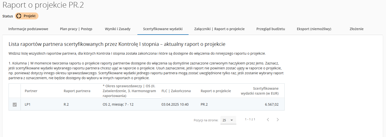 Gdy scertyfikowane raporty partnerów zostaną uwzględnione w raporcie o projekcie, nie można ich już wybierać w przyszłych raportach o projekcie.