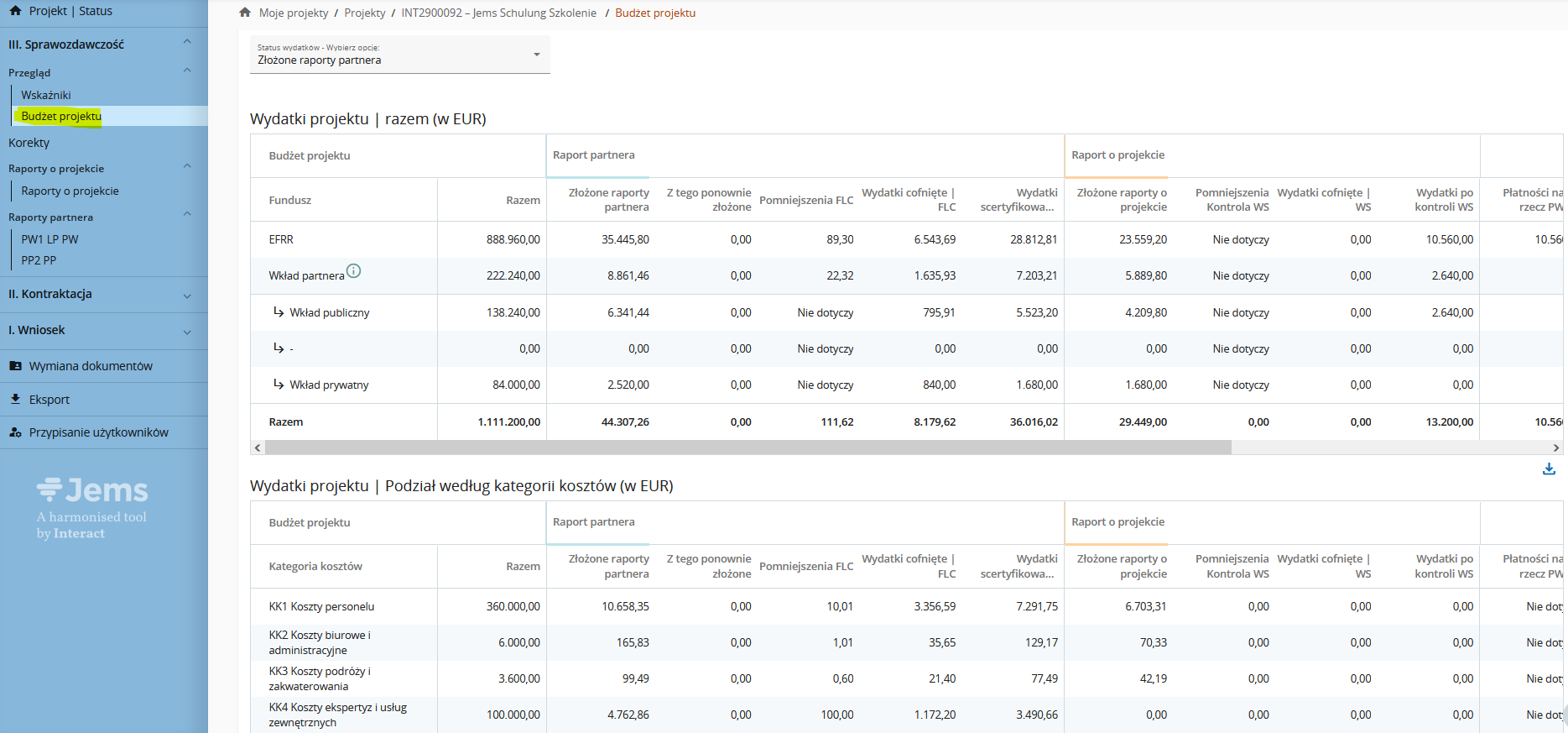 W sekcji „Przegląd – Budżet projektue” (patrz nawigacja po lewej stronie powyżej „Raporty o projekcie”) znajdują się najnowsze dane finansowe dotyczące projektu i partnerów. Funkcja jest dostępna od wersji 11 Jems.