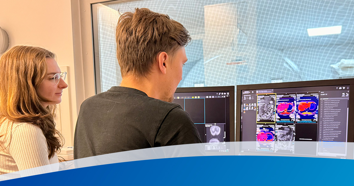 Dipl.-pharm. Lydia Neubauer (doktorantka w Instytucie Farmacji Uniwersytetu w Greifswaldzie) i dr Linus Großmann (adiunkt w tym samym instytucie) monitorują przebieg swoich badań w ramach projektu HEALTH.AI Pomerania z konsoli sterującej tomografem rezonansu magnetycznego. Na tym etapie analizowane są zdjęcia badanego pacjenta: dane obrazowe i wideo z badania MRI są analizowane przy pomocy sztucznej inteligencji (AI). Pracownicy projektu opracowują w Euroregionie Pomerania całkowicie nowatorską metodę diagnozowania funkcjonalnych zaburzeń trawienia za pomocą sztucznej inteligencji.