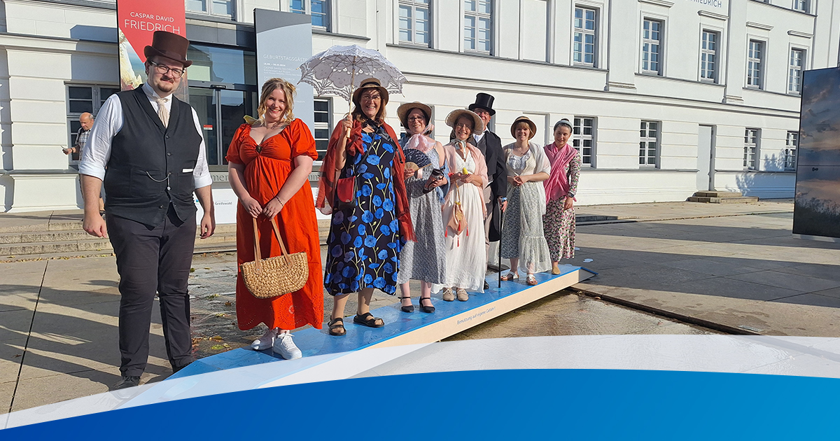 Zdjęcie przedstawia niemiecki zespół projektowy w kostiumach romantycznych w dniu 5 września 2024 r., w 250. rocznicę urodzin Caspara Davida Friedricha. Po rozpoczęciu projektu 1 lipca rocznica ta była pierwszym ważnym wydarzeniem na „wspólnej drodze ku sztuce”, której centrum w Greifswaldzie stanowi Caspar David Friedrich, najsłynniejszy Pomorzanin na świecie!